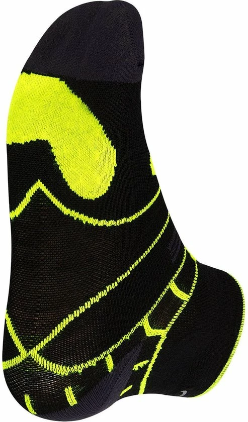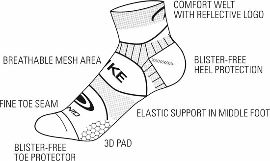 De 3D zone in de hak vermindert wrijving en biedt ondersteuning waarmee je blaren en andere irritaties voorkomt. Ook zorgt deze zone onder de bal van de voet dat drukpunten worden voorkomen en dat zowel de middenvoet als de enkel ondersteund wordt. De sokken hebben een reflecterende print aan de achterzijde.