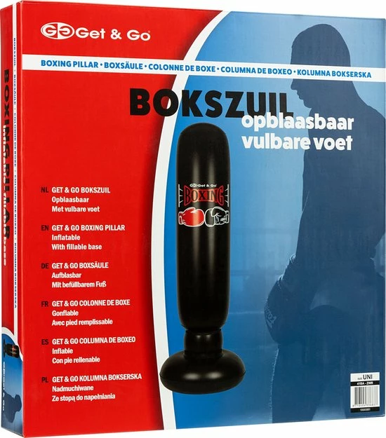 Leren boksen of kickboksen was nog nooit zo leuk en gemakkelijk! Met de Get & Go opblaasbare bokstrainer met vulbare voet blijf je fit en kun je lekker trainen. De staande boksbal is gemakkelijk overal mee naartoe te nemen. Hij is namelijk licht van gewicht, gemakkelijk opblaasbaar en kan overal stevig en stabiel neergezet worden door de voet te vullen met water of zand (minimaal 15L). Zo kun je op allerlei plekken, bijvoorbeeld in de tuin, gymzaal of in het park, heerlijk boksen om je conditie en kracht te verbeteren of natuurlijk voor je plezier! Dankzij het dikke PVC materiaal (0,35mm) is de bokstrainer extra stevig en gaat deze niet snel lekken. De bokszak is afsluitbaar door middel van een dubbele dop, waardoor er geen lekkage komt door het water of het zand. De boksbal is geschikt voor recreatief gebruik door jong en oud en vooral leuk als cadeau voor sportieve kids!