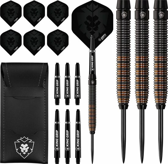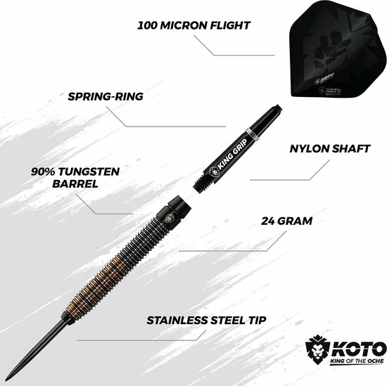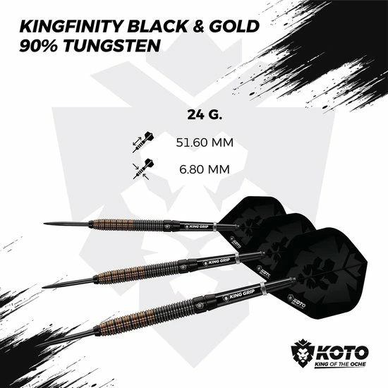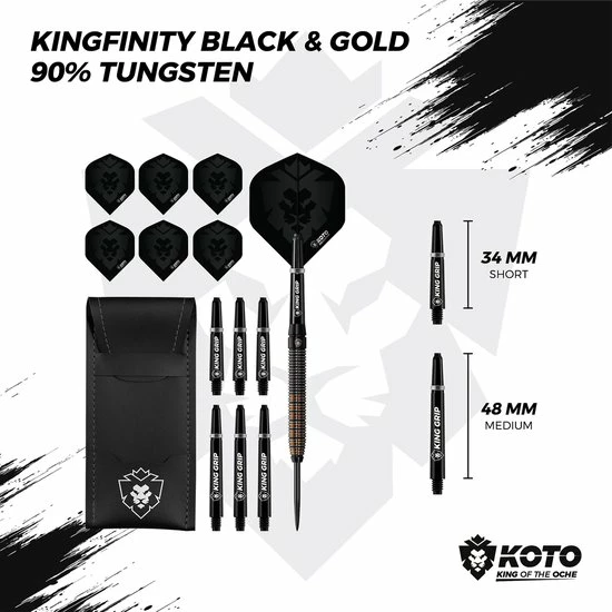 ✅ Complete set dartpijlen: De KOTO Kingfinity Black & Gold 90% – Dartpijlen – 24 Gram – Tungsten Darts – Zwart & Goud wordt geleverd als complete set. De set bestaat uit 3 barrels, twee sets KOTO flights met logo, twee sets KOTO shafts in de maat short en medium en een dartwallet met KOTO logo.