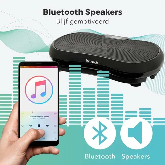 Speel je favoriete muziek af via de ingebouwde speaker en haal net dat beetje extra uit je workout. Je kan de trilplaat eenvoudig koppelen met je Apple of Android apparaat via Bluetooth 5.0. Vervolgens kun je audio afspelen en het volume regelen via je tablet of smartphone. Het geluidsniveau van de trilplaat is door de low-noise technologie slechts 60 dB. Daar hoor je je muziek dus makkelijk bovenuit.