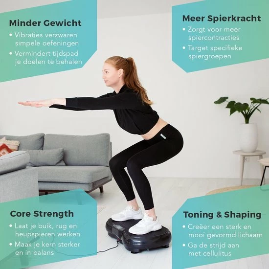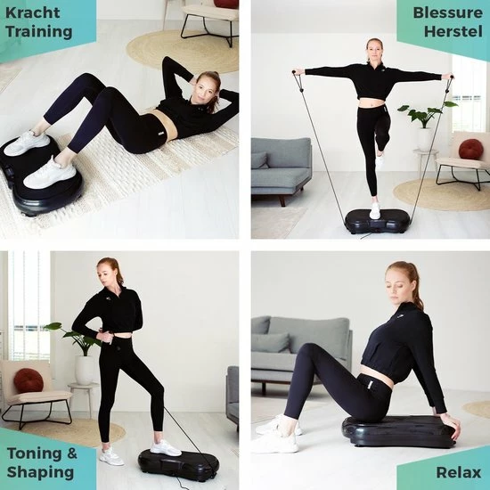 De 200W Trilplaat heeft 180 intensiteitslevels en gaat tot 2700 vibraties per minuut. Kies een lagere intensiteit voor een lekkere warming-up of cooling down. Verhoog het intensiteitslevel om je trainingssessie nog uitdagender te maken. Door het antislip oppervlak blijf je altijd stevig staan. Je kan zelf de timer instellen van 01:00 – 20:00 min. Daarnaast krijg je er ook een workout poster bij met verschillende oefeningen. Perfect voor ervaren en beginnende sporters.