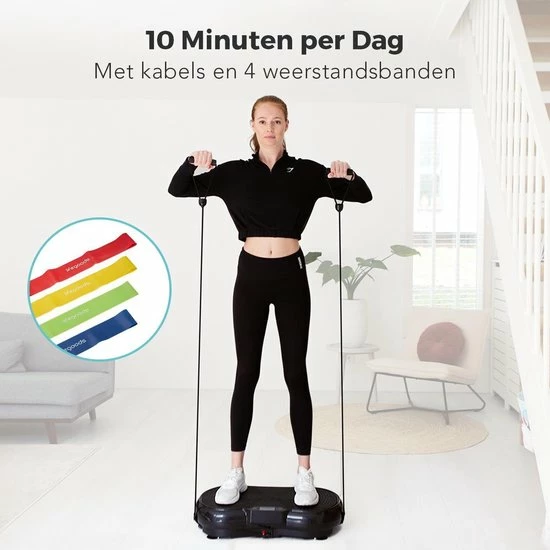 Om je hele lichaam te kunnen trainen, krijg je bij de trilplaat 2 weerstandskabels met handvat en 4 rubberen resistance bands. De weerstandskabels met handvatten kan je vastklikken aan de trilplaat om nog meer oefeningen in je workout te verwerken. De rubberen resistance bands hebben verschillende weerstanden, voor ieder wat wils!