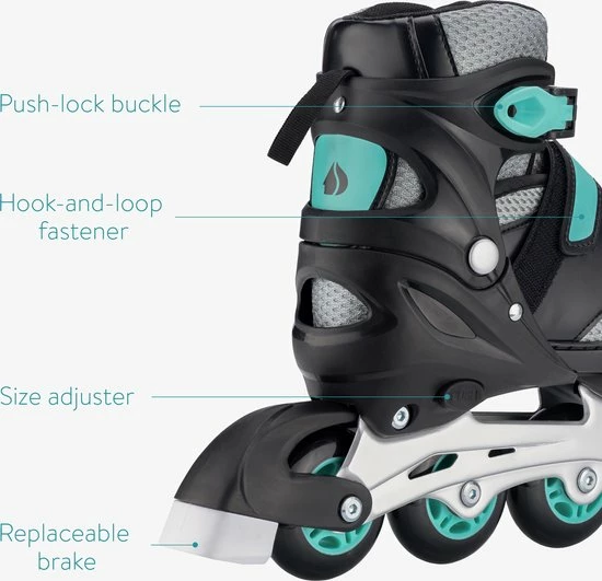 - MAKKELIJK AANPASSEN: Om de maat aan te passen druk je op de push-knop aan de rechterkant van de skeeler. Houd de knop ingedrukt en schuif tegelijkertijd de skate naar de gewenste maat.