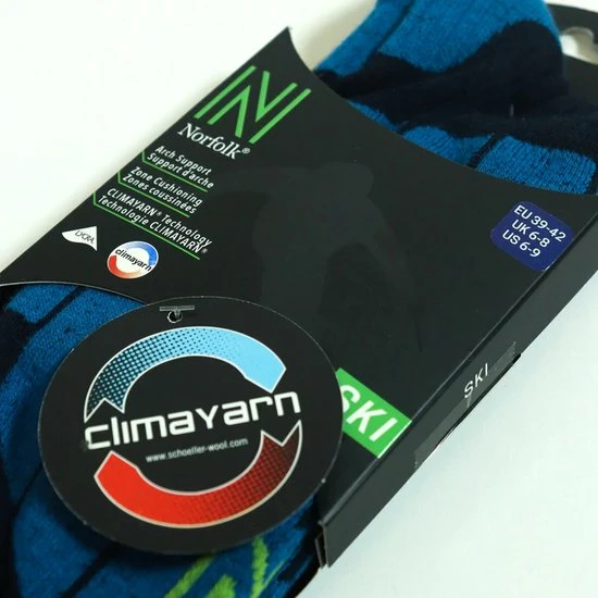 Norfolk’s Aspen ski socks allow your feet to breathe while keeping them warm and dry. With cutting-edge Climayarn technology, our thermal ski socks will expel humidity and keep you warm during low temperatures, as well as preventing overheating. With zone cushioning on the leg and foot, these socks have been designed to absorb pressure and guard against impact abrasion, ensuring your feet are prepped for a day on the slopes. What every skier needs on the slopes is a good pair of ski socks.