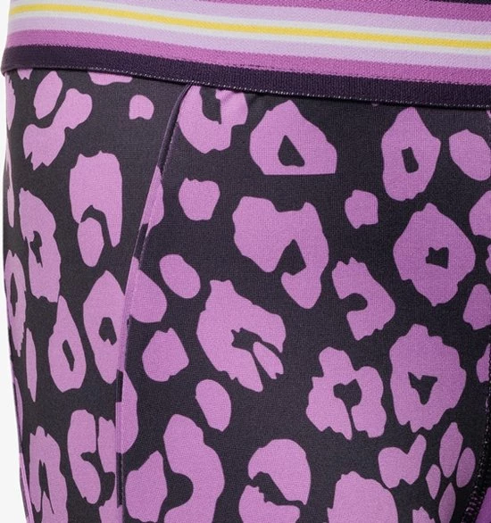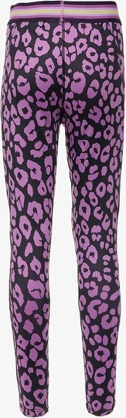 Paarse sportlegging voor meisjes uit de Osaga collectie. Voorzien van een elastische tailleband en aansluitende pasvorm. De sportlegging is lekker elastisch zodat je vrij kunt bewegen tijdens het beoefenen van bijvoorbeeld fitness, hardlopen of gym. Voorzien van roze biezen op de boord en een all over luipaardprint. De sportlegging is gemaakt van 84% polyester en 16% elastaan.