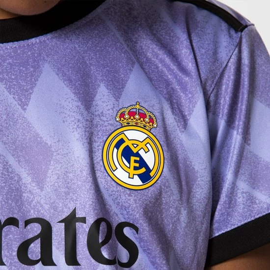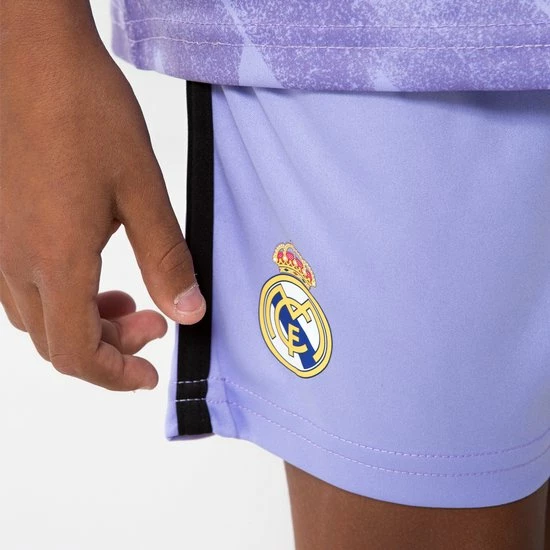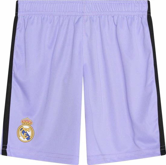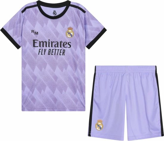 Real Madrid uit tenue 22/23 Real Madrid heeft fans over de wereld, ben of ken jij ook een echte Real Madrid fan? Dan is dit Real Madrid uit tenue 22/23 voor kinderen perfect! Het Paarse uit tenue van Real is gemaakt van 100% polyester en is daarmee perfect voor een goed potje voetbal of om te dragen in de vrije tijd. De dunne stof zit ontzettend comfortabel, ademt goed en is bovendien ook nog makkelijk schoon te maken. Bekijk snel of we de juiste maat nog op voorraad hebben! Kenmerken * HERKENBAAR DESIGN: Het iconische Real Madrid logo vind je terug aan de linkerzijde van het shirt en op de broek. * COMPLEET VOETBALTENUE: Dit Real Madrid thuis tenue bestaat uit een shirt en broekje, klaar om in te bewegen! * COMFORTABEL: Het Real Madrid tenue is gemaakt van 100% polyester. Gemakkelijk schoon te maken en comfortabel om te dragen! * OFFICIEEL CLUBTENUE: Deze Real set hoort bij de officiรซle Real Madrid merchandise collectie. Daardoor is kwaliteit een garantie.