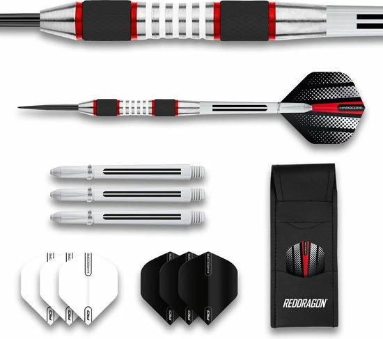 Set 24 gram – Set van 3 x premium kwaliteit Red Dragon kwaliteit wolfraam darts. Set dartpijlen wordt compleet geleverd met Nylon Ring Grip dartshafts, 3 sets extra dik RED DRAGON Hardcore dartflights. Red Dragon portefeuille.Deze nauwkeurig bewerkte snijpijlen hebben een uitstekende grip langs hun slanke en gestroomlijnde barrels.Verkrijgbaar in 24 g, 26 g, 28 g gewicht.