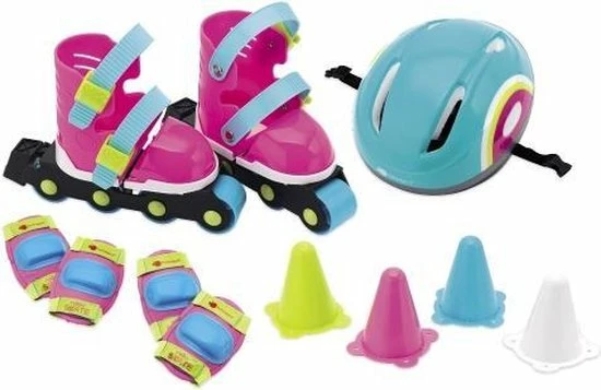 Rugzak met complete skateset. Inline skates (4 standen, afhankelijk van de voetmaat), helm, elleboogbeschermers, kniebeschermers en 4 kegels. Geschikt voor de maten: 24 t/m 29.