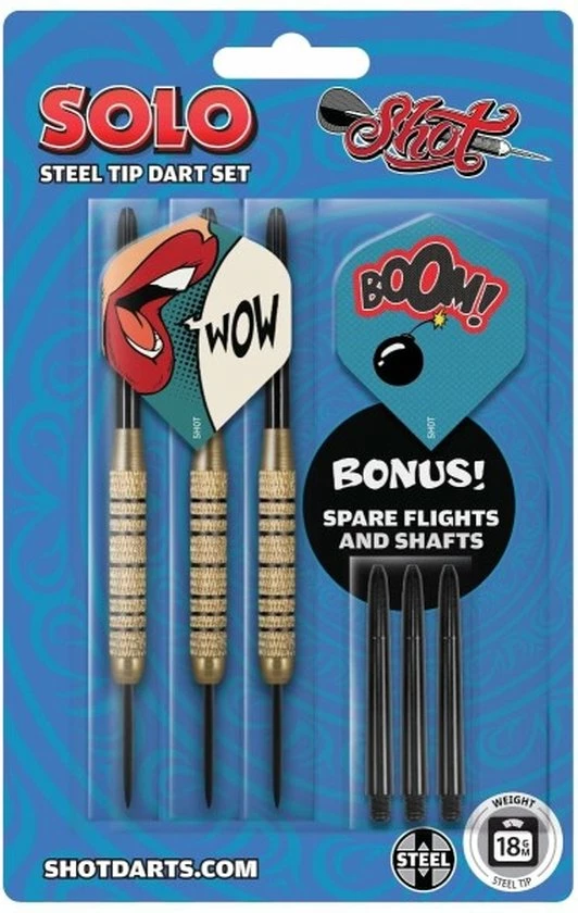 Shot! Solo Brass Plated Steeltip 18g is een complete sets darts inclusief een extra setje reserve shafts en flights. Ideaal voor de beginnende darter.