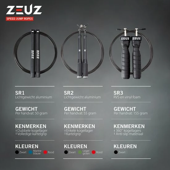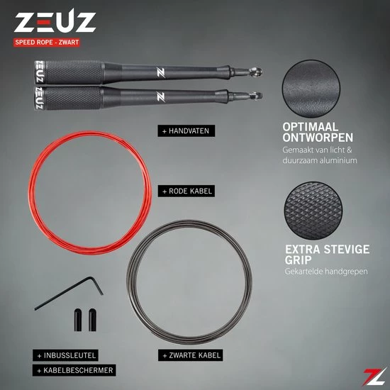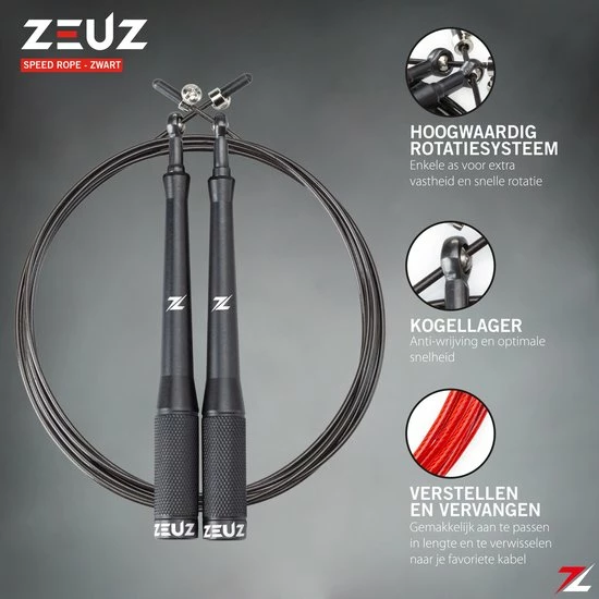 In de springtouw set van ZEUZ is overal aan gedacht. Naast dat je de touw perfect kan afstellen op jouw lengte zijn er twee touwen in de set inbegrepen, 1 zwarte kleur & 1 rode kleur touw. Zo kan je bijvoorbeeld je favoriete kleur kiezen, de springtouw gebruiken met 2 personen of extra lang met je touwtjes springen. Let op! Bij een stenen grond slijt het touw sneller dan een rubberen grond.